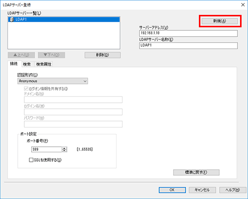 3. [新規]をクリックしてLDAPサーバーの情報を登録し、[OK]をクリックします。