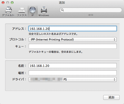 [アドレス:]に本機のIPアドレスを入力し、[キュー:]に「ipp」を入力します。