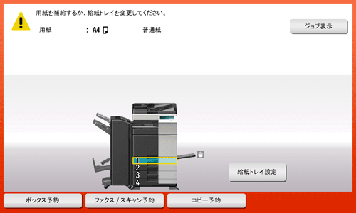 印刷中に用紙がなくなると、用紙の補給をうながすメッセージが表示されます。用紙のサイズと種類を確認して、色付き表示されたトレイに補給してください。