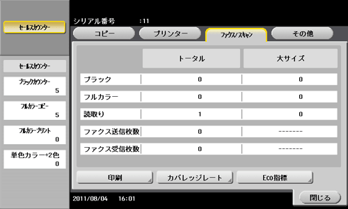 [読取り] | ファクス/スキャンモードおよびボックスモードで、読込んだ原稿のページ数の合計値です。 | ファクス/スキャンモードおよびボックスモードで、読込んだ大サイズの原稿のページ数の合計値です。 |
