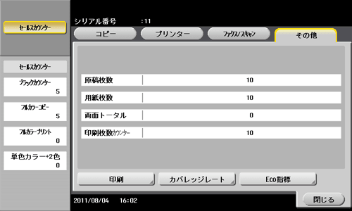 コピーしたページ数の合計値を確認できます。(コピーモードからボックス保存したデータを印刷したページ数、[管理者設定]でリスト出力したページ数も含みます。)