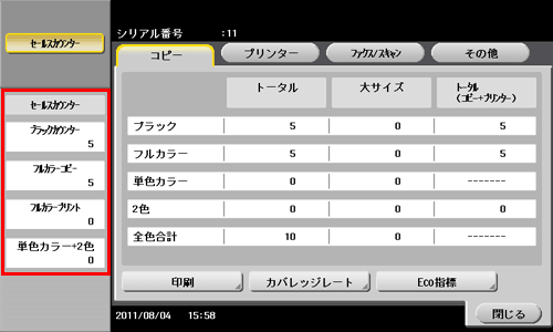 [フルカラーコピー] | フルカラーでコピーしたページ数の合計値を確認できます。 |