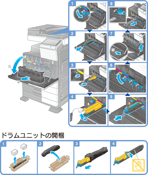 ドラムユニットは光によるダメージを受けることがあります。取付ける直前まで黒色のポリ袋から出さないでください。