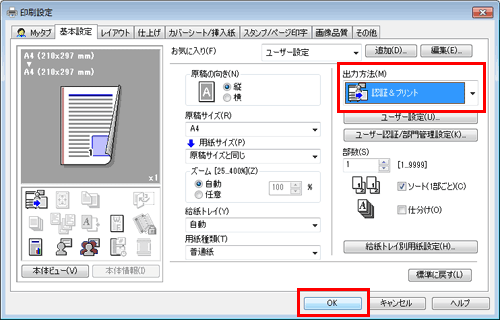 [出力方法]から、[認証&プリント]を選び、[OK]をクリックします。