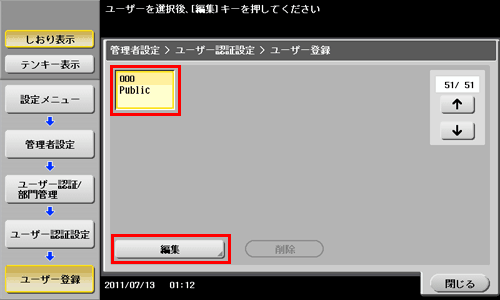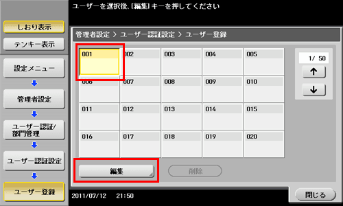 [ユーザー認証/部門管理]-[ユーザー認証設定]-[ユーザー登録]を選びます。