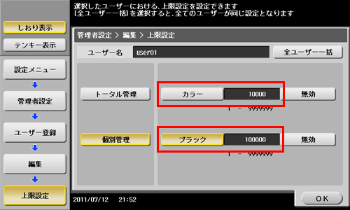 [上限設定]をタップし、[カラー]または[ブラック]をタップして、ユーザーが印刷できるカラー原稿およびブラック原稿の上限値をテンキーで入力します。