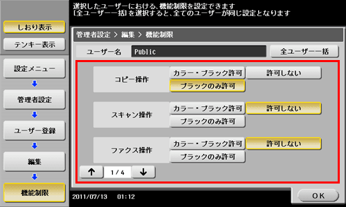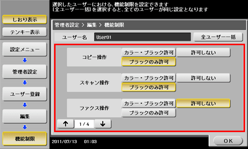 手順4 ~ 7を繰返して、各ユーザーが使用できる機能を制限します。