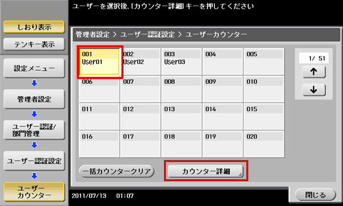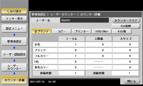 [ユーザー認証/部門管理]-[ユーザー認証設定]-[ユーザーカウンター]を選びます。