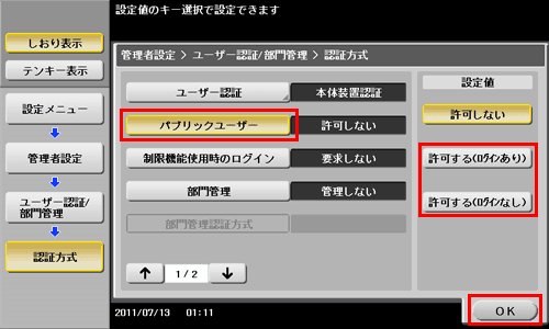 [許可する(ログインなし)]を選ぶと、パブリックユーザーは、ログイン画面でログインせずに本機を使用できます。