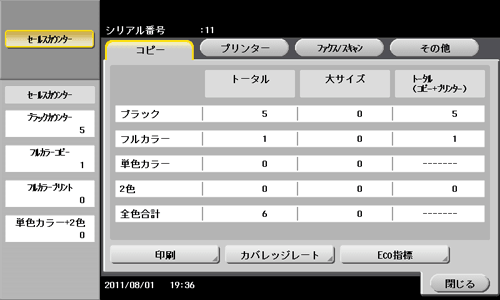 A5. これまでにコピーした総枚数やコピーカラーごとの枚数などを確認できます。