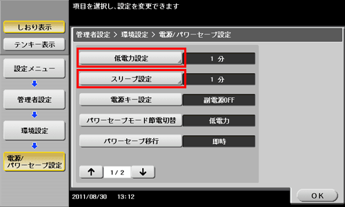 スリープモードは低電力モードと比べて、より高い節電効果を得ることができますが、再度印刷を行う場合は、ウォームアップにかかる時間が低電力モードよりも長くなります。本機の使い方に合わせて設定してください。