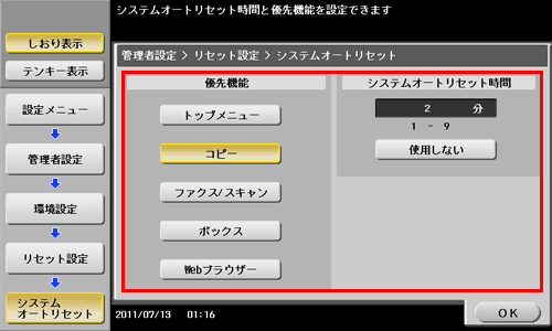 リセット後に表示する機能を選び、初期値に戻すまでの時間をテンキーで入力します。