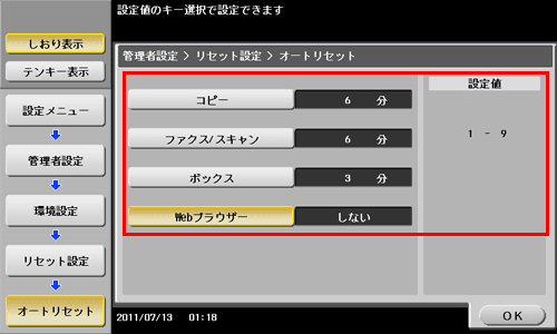 各機能を選び、初期値に戻すまでの時間をテンキーで入力します。