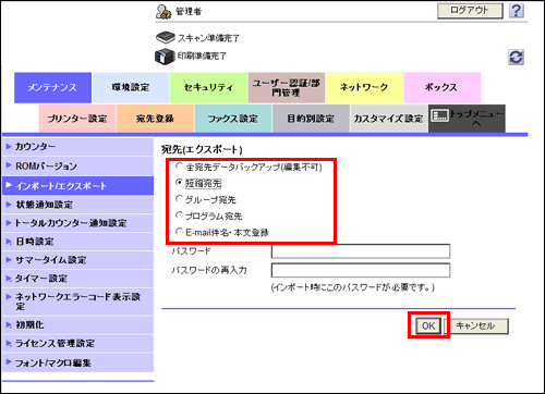 パスワードを入力してエクスポートすると、別の複合機に宛先をインポートするときに、パスワードの入力が必要になります。