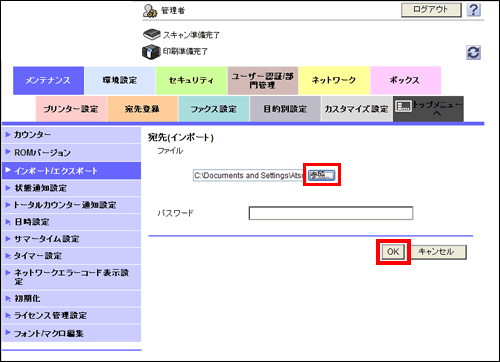 全宛先データのバックアップファイルをインポートする場合、現在登録されているすべての宛先情報が上書きされますので、ご注意ください。