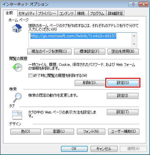 [閲覧の履歴]の[設定]をクリックします。