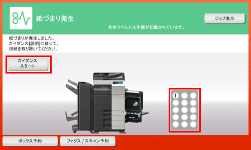 本機で紙づまり/針づまりが発生すると、下の図のようにタッチパネル上に紙づまり/針づまりが発生している位置が表示されます。紙づまり/針づまりが発生した場合は、タッチパネルで発生位置を確認し、ガイダンスに従って処理を行ってください。