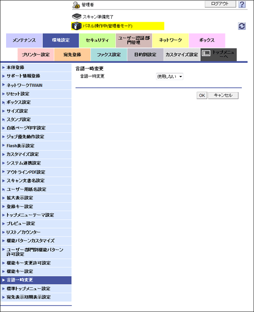 管理者モードの[環境設定]-[言語一時変更]で、[言語一時変更]を[使用する]に設定します(初期値:[使用しない])。