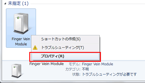 [未指定]カテゴリーに表示されている認証装置のデバイス名(もしくは[不明なデバイス])を右クリックし、[プロパティ]をクリックします。