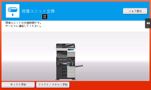現像ユニットが交換時期に達すると、サービス実施店へ連絡するようメッセージが表示されます。メッセージが表示されたら、サービス実施店にご連絡ください。