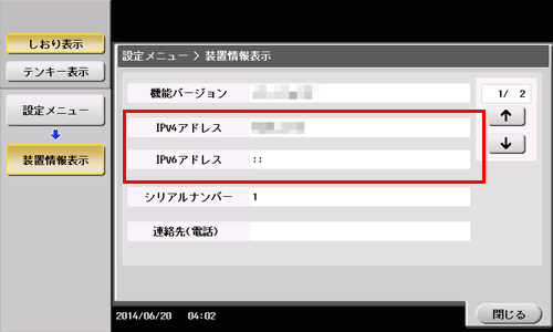 操作パネルの[設定メニュー]-[装置情報表示]で、本機のIPアドレスを確認します。