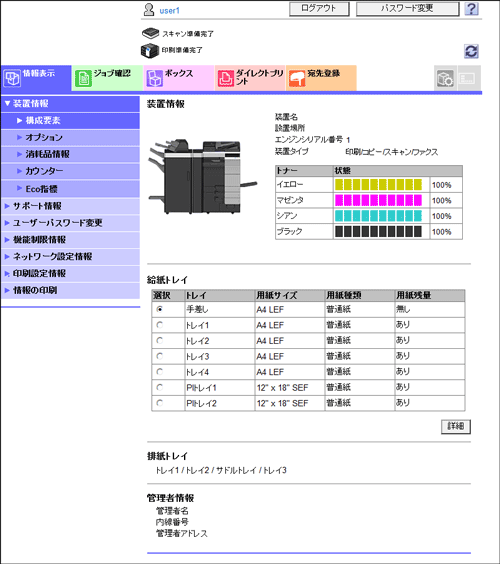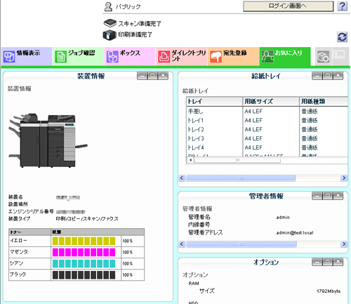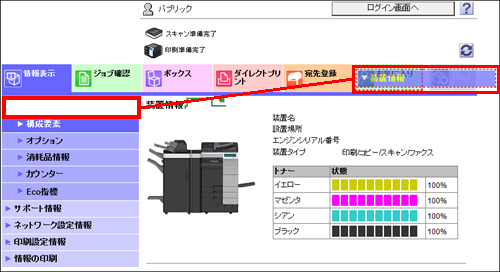 [装置情報] | 本機の構成要素、オプション、消耗品情報、カウンター、Eco指標を確認できます。 |