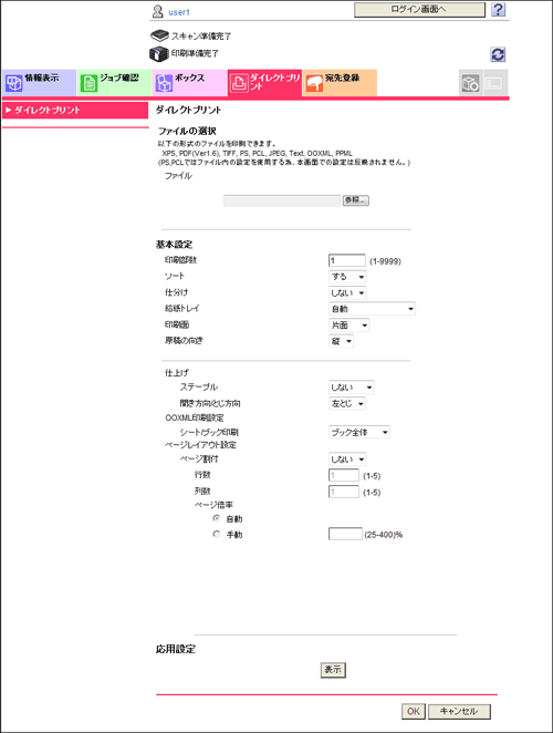 ダイレクトプリントは、プリンタードライバーを使わずに、コンピューター上のPDF(Ver.1.6)、JPEG、TIFF、XPS、PS、PCL、Text、OOXML(.docx/.xlsx/.pptx)、PPML(.ppml/.vdx/.zip) ファイルを直接本機に送信して印刷する機能です。