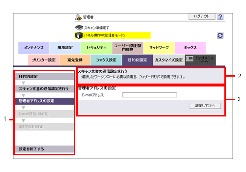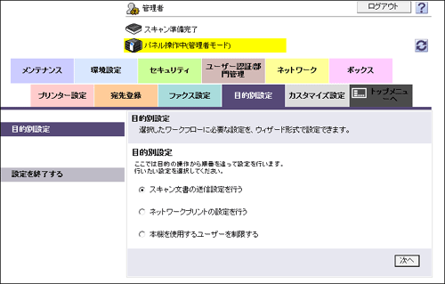 ウィザードを利用して設定するには、管理者モードにログインして、[目的別設定]を選びます。