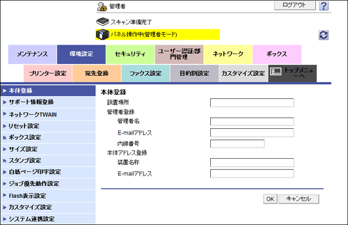 [管理者登録] | 本機の管理者の情報を登録します。 | |