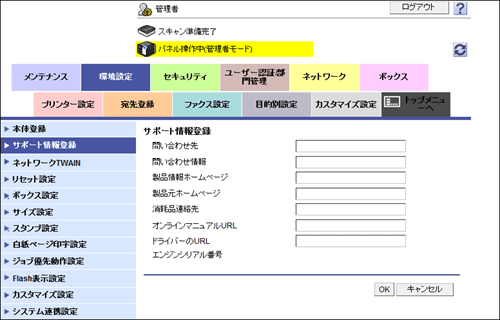 管理者モードの[環境設定]-[サポート情報登録]で、次の設定をします。