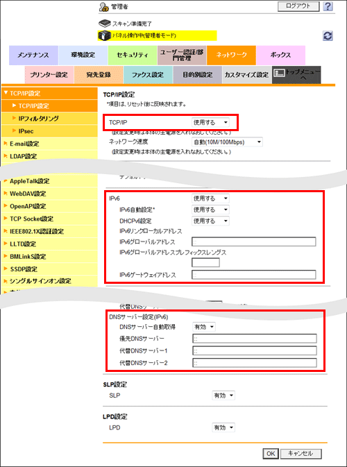 管理者モードの[ネットワーク]-[TCP/IP設定]-[TCP/IP設定]で、次の設定をします。