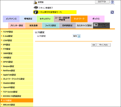 管理者モードの[ネットワーク]-[LLTD設定]で、[LLTD設定]を[有効]に設定します(初期値:[有効])。