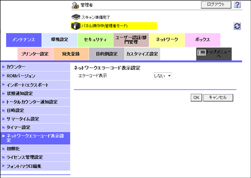 管理者モードの[メンテナンス]-[ネットワークエラーコード表示設定]で、[エラーコード表示]を[する]に設定します(初期値:[しない])。