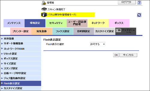 管理者モードの[環境設定]-[Flash表示設定]で、[Flash表示の選択]を[許可しない]に設定します(初期値:[許可する])。