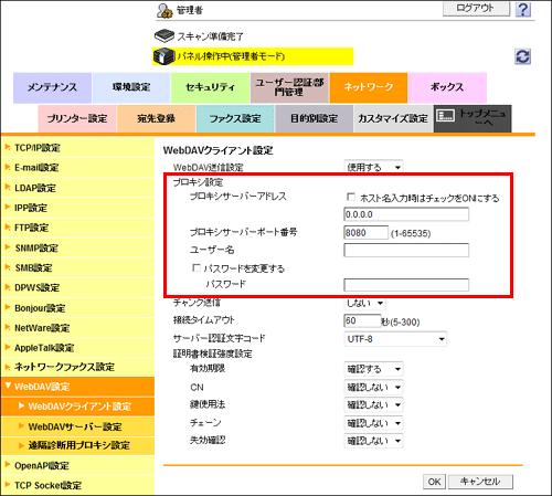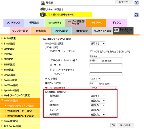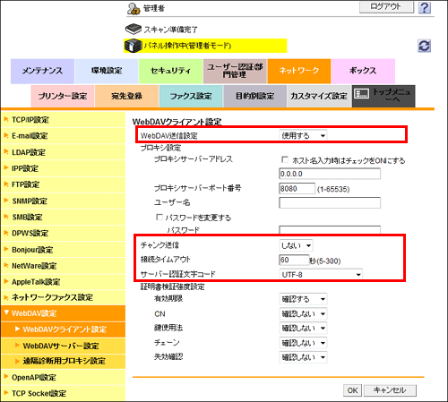管理者モードの[ネットワーク]-[WebDAV設定]-[WebDAVクライアント設定]で、次の設定をします。