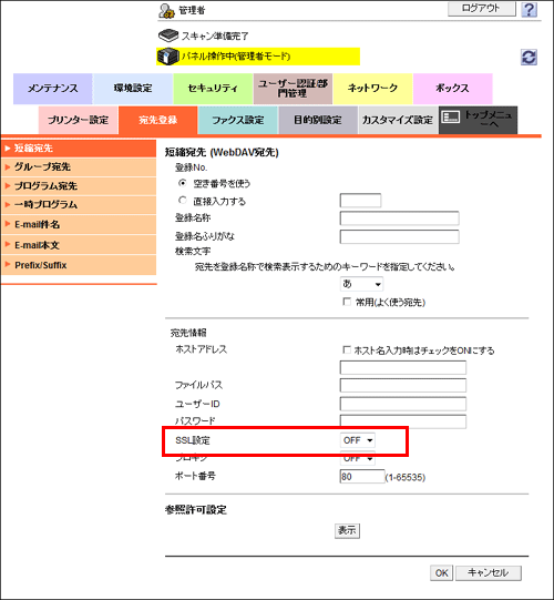 管理者モードの[宛先登録]-[短縮宛先]で[WebDAV宛先]を選び、[SSL設定]を[ON]に設定します(初期値:[OFF])。