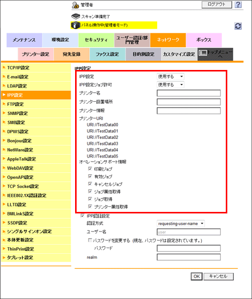 管理者モードの[ネットワーク]-[IPP設定]で、次の設定をします。