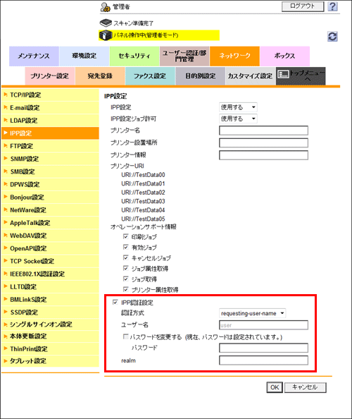 IPP印刷時に認証を行うには、IPP認証を有効にします。あわせて、認証に必要な情報を設定します。