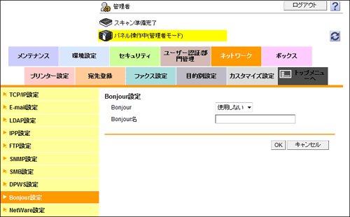 管理者モードの[ネットワーク]-[Bonjour設定]で、次の設定をします。