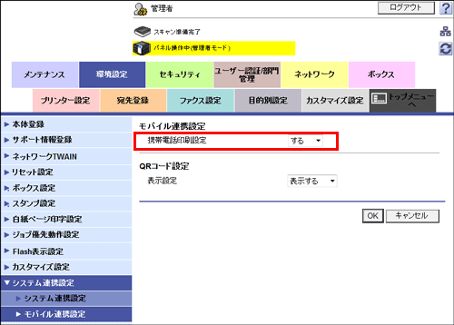 管理者モードの[環境設定]-[システム連携設定]-[モバイル連携設定]で、[携帯電話印刷設定]を[する]に設定します(初期値:[する])。