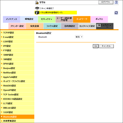 管理者モードの[ネットワーク]-[Bluetooth設定]で、[Bluetooth]を[有効]に設定します(初期値:[有効])。