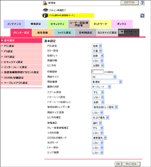 管理者モードの[プリンター設定]-[基本設定]で、次の設定をします。