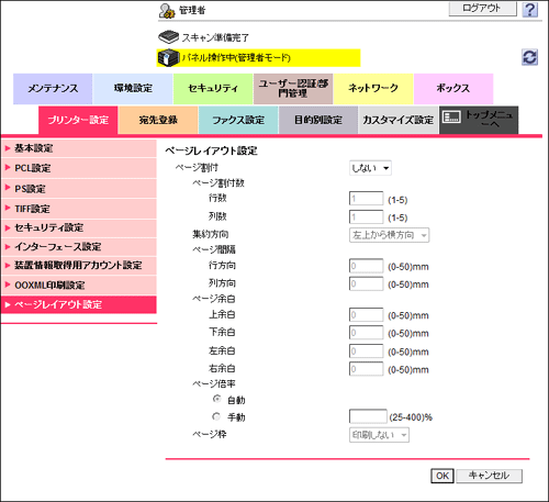 管理者モードの[プリンター設定]-[ページレイアウト設定]で、次の設定をします。