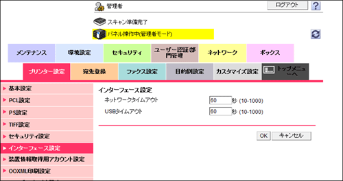 管理者モードの[プリンター設定]-[インターフェース設定]で、次の設定をします。