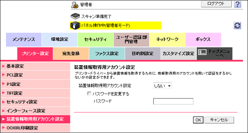 管理者モードの[プリンター設定]-[装置情報取得用アカウント設定]で、次の設定をします。