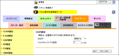 管理者モードの[ネットワーク]-[SSDP設定]で、次の設定をします。