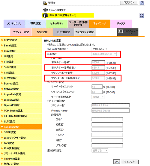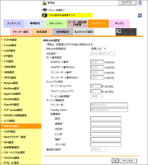 BMLinkSを有効にします。あわせて、BMLinkSのプリンタードライバーと接続するための設定や、本機の情報の登録、BMLinkSへの通知に関する設定などを行えます。