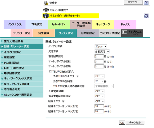 管理者モードの[ファクス設定]-[回線パラメーター設定]で、次の設定をします。