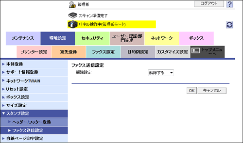 管理者モードの[環境設定]-[スタンプ設定]-[ファクス送信設定]で、[解除設定]を[解除する]に設定します。