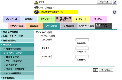 管理者モードの[ファクス設定]-[機能設定]-[ダイアルイン設定]で、次の設定をします。